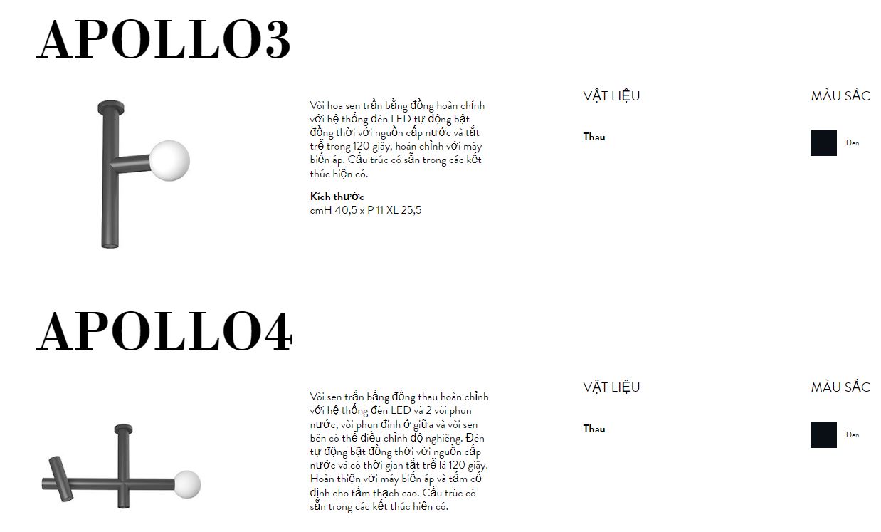 Apollo, một nguồn ánh sáng. Ánh sáng và Nước: Apollo là một bộ sưu tập vòi sen kết hợp hai yếu tố này lại với nhau, kết nối chúng thành một thành phần duy nhất ở dạng nguyên chất. Nó là một vật thể lai trong đó không có chức năng nào chiếm ưu thế về mặt nhận thức: nó là một chiếc đèn nhưng đồng thời cũng là một đầu vòi hoa sen. Apollo giới thiệu một loại vòi hoa sen mới mà thoạt nhìn có thể khiến bạn hơi bối rối vì không dễ hiểu được bản chất kép của nó có khả năng phát ra ánh sáng và nước, nhưng sự mơ hồ về mặt hình học là một phần tạo nên sức hấp dẫn của nó.